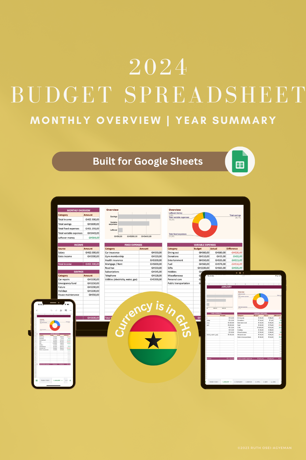 With this budget spreadsheet (built for Google Sheets), you can easily track your income, expenses, savings, and your budget. The currency for this spreadsheet is GHS. If you prefer EUR, GBP, or USD, please have a look at the other products listed.